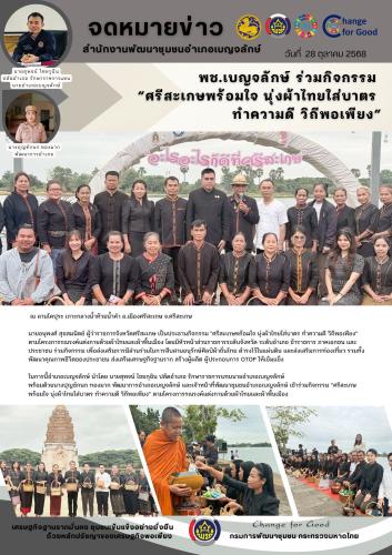 นายอนุพงศ์ สุขสมนิตย์ ผู้ว่าราชการจังหวัดศรีสะเกษ เป็นประธานกิจกรรม "ศรีสะเกษพร้อมใจ นุ่งผ้าไทยใส่บาตร ทำความดี วิถีพอเพียง” ตามโครงการรณรงค์แต่งกายด้วยผ้าไทยและผ้าพื้นเมือง โดยมีหัวหน้าส่วนราชการระดับจังหวัด ระดับอำเภอ ข้าราชการ ภาคเอกชน และประชาชน ร่วมกิจกรรม เพื่อส่งเสริมการมีส่วนร่วมในการสืบสานอนุรักษ์ศิลป์ผ้าถิ่นไทย ดำรงไว้ในแผ่นดิน และส่งเสริมการท่องเที่ยว รวมทั้งพัฒนาคุณภาพชีวิตของประชาชน ส่งเสริมเศรษฐกิจฐานราก สร้างผู้ผลิต ผู้ประกอบการ OTOP ให้เข้มแข็ง