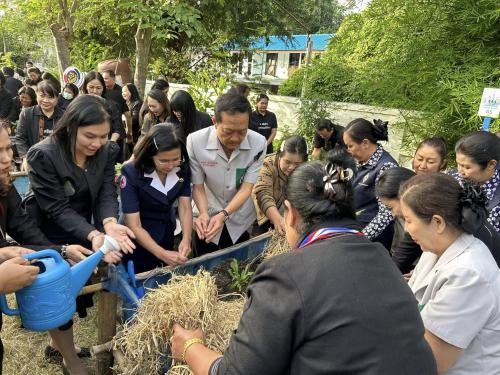 นายอนุรัตน์ ธรรมประจำจิต ผู้ว่าราชการจังหวัดศรีสะเกษ พร้อมด้วยนางโสภา ธรรมประจำจิต นายกเหล่ากาชาดจังหวัดศรีสะเกษ นางทรัพย์สิน โพธิ์ขาว พัฒนาการจังหวัดศรีสะเกษ หัวหน้าส่วนราชการ ภาคีเครือข่าย และสมาชิกเหล่ากาชาดจังหวัดศรีสะเกษ ร่วมกิจกรรมการน้อมนำแนวพระราชดำริของสมเด็จพระกนิษฐาธิราชเจ้า กรมสมเด็จพระเทพรัตนราชสุดาฯ สยามบรมราชกุมารี สู่ปฏิบัติการปลูกผักสวนครัว เพื่อสร้างความมั่นคงทางอาหาร ตามแนวคิด “ผู้นำทำก่อน”